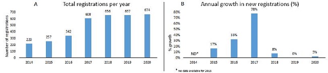 There were 454 new registrations between 2014 and 2020 (Figure 3a), and an average growth of new registrations of 43% per year between 2015 and 2017 (Figure 3b). In the subsequent years, 2018 to 2020, new registrations fell to an average growth of 4% per year (Figure 3b), denoting a stagnation in the insertion of new registrations of organic producers in Bahia.