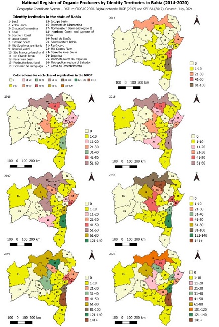 Considering that organic production adopts new production systems that can contribute greatly to the environmental planning of a given region, the objective herein was to analyze the spatial and temporal dynamics of the records organic producers and their certification bodies in Bahia, in the period from 2014 to 2020, using the state’s ITs as a spatial division throughout the study.