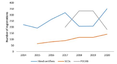 There was a reduction in new registrations by SPGs in 2020 (Figure 6 and Table 1), which may have occurred due to the process of reassessment of certification. When certified farmers who do not correct non-conformities identified by their group, they end up leaving the relationship, only returning if they later comply and receive approval in a new process. In this sense, continuous and more in-depth monitoring of CNPO data is relevant.