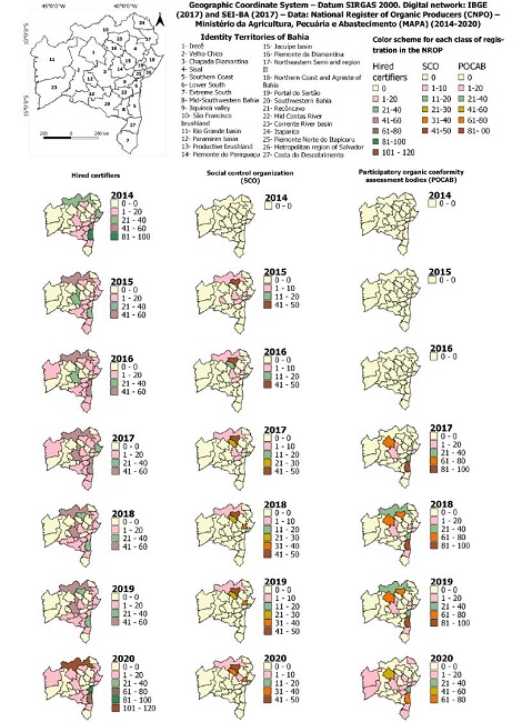 A spatialization of the number of registrations in the CNPO was carried out, based on the type of the certification process and distribution in the ITs of the state of Bahia, for the period from 2014 to 2020 (Figure 7).