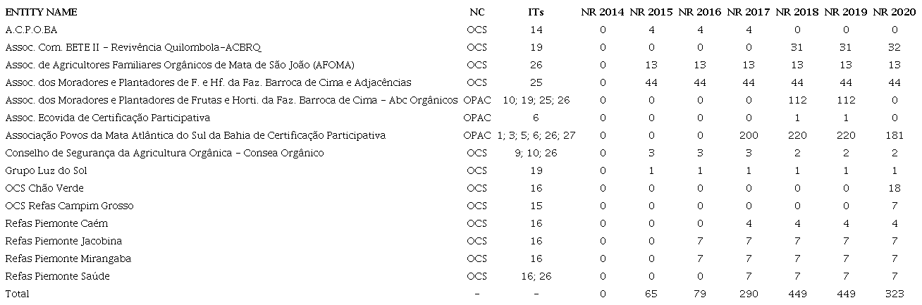 The OCSs corresponded to 80% of the entities; however, the OPACs have more prominence in the amount of registrations, especially the Associação Povos da Mata, which acted in six ITs with a large amount of registrations, and the Assoc. Abc Organics, which acts mainly in the IT-25-Piedmonte Norte de Itapicuru (Table 1).