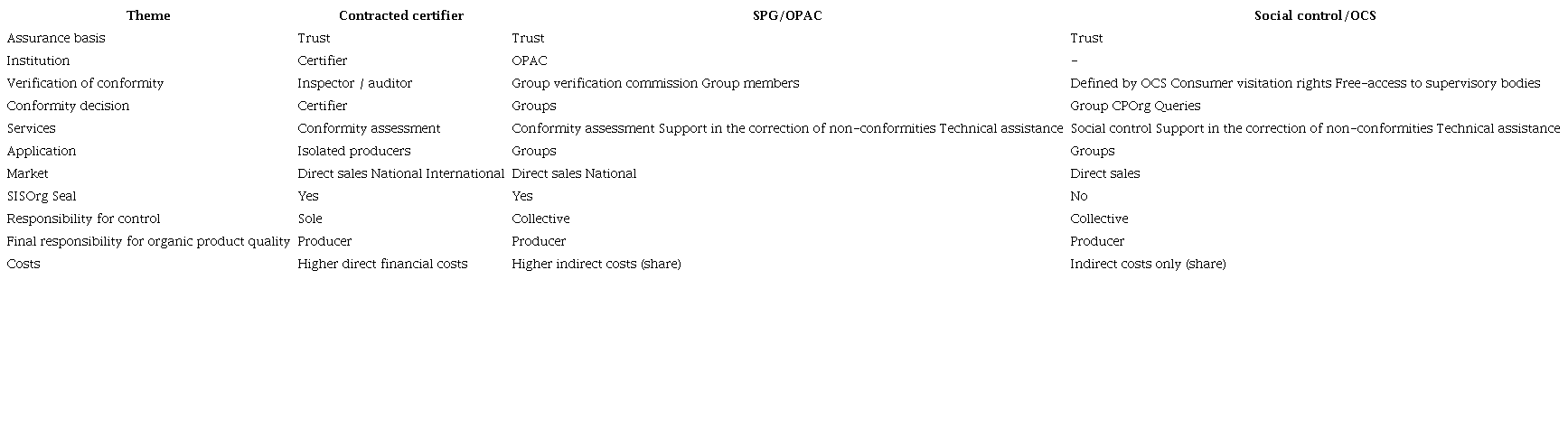 There are three organic quality control mechanisms: i) certification by a contracted certifying company, which performs audits on the property; ii) Sistemas Participativos de Garantia da Qualidade Orgânica (SPG), a participatory organic quality assurance systems, by OPAC, a participatory organic conformity assessment bodies; iii) social control, by OCS, a social control organization (BRASIL, 2007). The Associação de Agricultores Biológicos do Rio de Janeiro (ABIO, 2016), an association of organic farmers of Rio de Janeiro, indicates some differences between these mechanisms (Table 1):