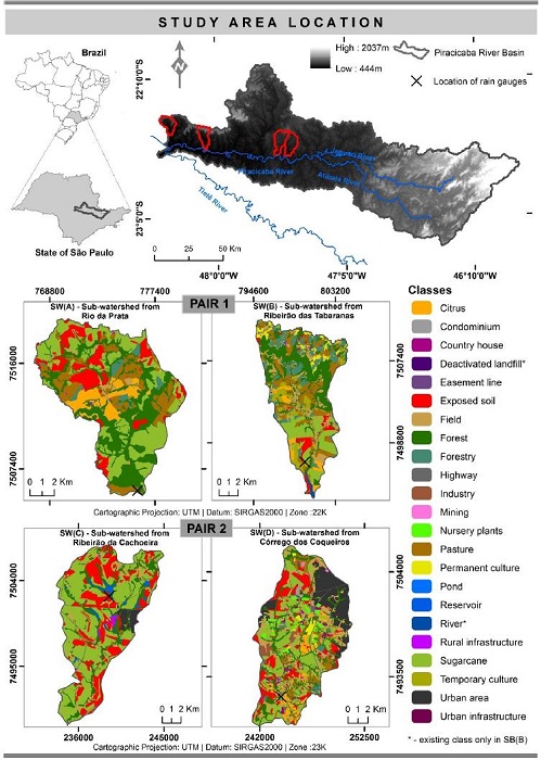 It is also essential to incorporate human activities into the analyses to comprehend the water regime of hydrographic regions, since changes in land use and cover, associated with climate change, represent risks to water supply and ecological integrity (TUNDISI; TUNDISI, 2015). For instance, a study carried out in the Luan River Basin by Wang et al. (2016) showed that anthropic actions have a greater effect on flow changes than the climate itself. Climatic variation contributed with 40.89% while anthropic activities with 59.11% of changes to the annual flow regime. In this context, the present study aimed to evaluate the water regime in two pairs of fourth-order branching sub-watersheds considering criteria established by Strahler (1957), located in the Piracicaba River Basin, in the southeast of Brazil.