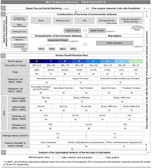 The methodological procedures applied in the two pairs of sub-watersheds inserted in PRB included data collection and preparation such as: fluviometric and pluviometric monitoring; survey and mapping attributes of natural and anthropic environments; making charts of surface runoff potential, through the method of Pejon (1992), based on the application of weights for each class of information planes, subsequently associated with the map algebra that results in the sum of information planes executed in the Raster Calculator tool of ArcGIS 10.5® software (Figure 2).