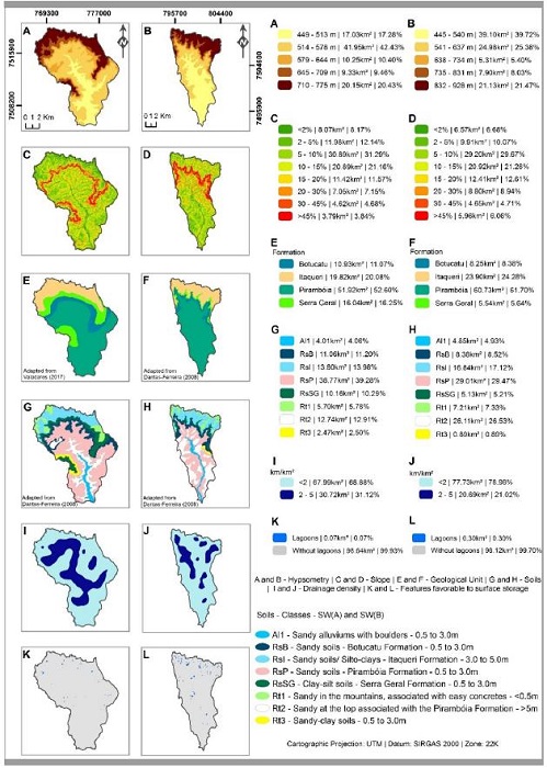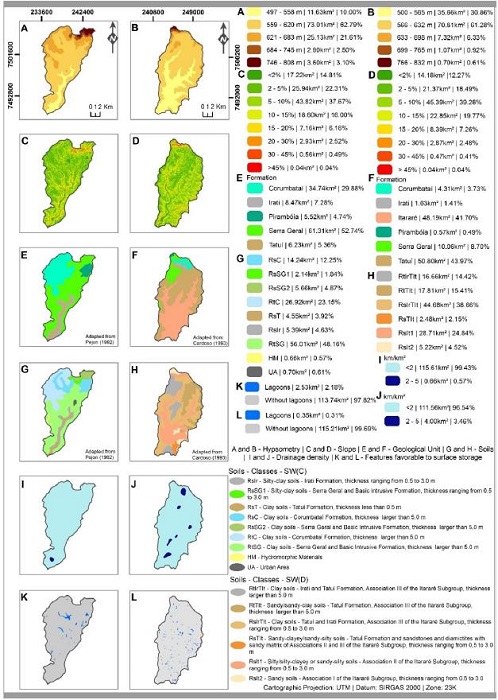 Figures 3 and 4 show the information plans used to understand the hydrological regime of the study areas. It is noteworthy that in these figures the items from C to L are the environmental attributes used for preparing the charts of surface runoff potential.