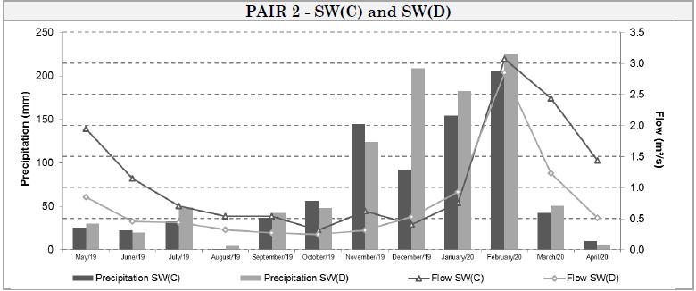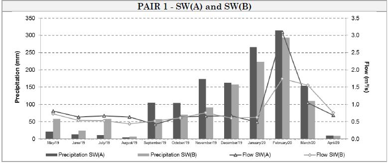 This abrupt flow increase in February 2020 in pair 1 can be evidenced by the influence of the measurement date, since there were 24 hours of rain before the measurement, comprising a precipitated volume of 25.6mm in SW(A) and 28.8mm in SW(B), significantly increasing the flow.
