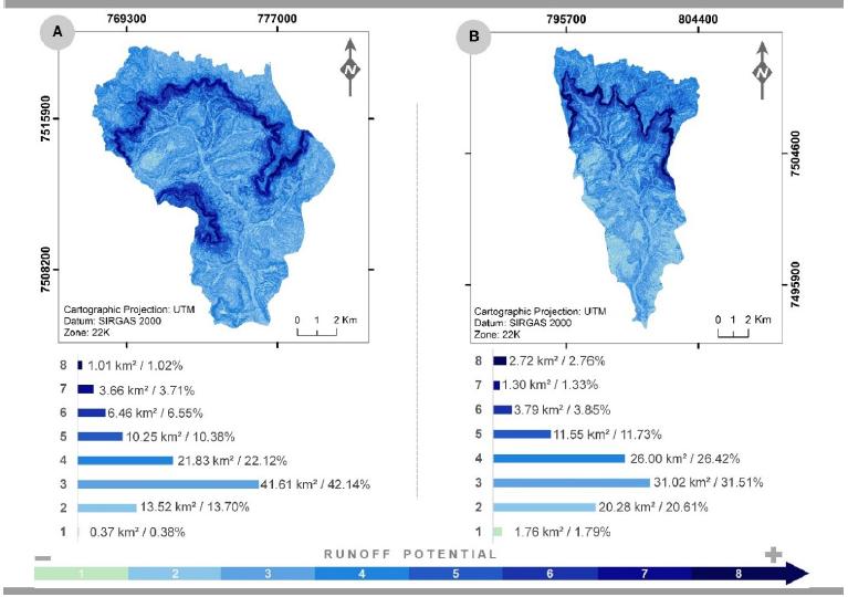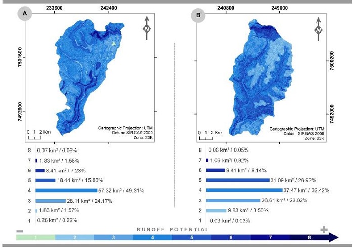 Through surface runoff potential charts, the evaluation of the physical characteristics of the sub-basins showed that these areas have very low to low potential, indicating greater infiltration capacity, emphasizing that the process of water infiltration in the soil establishes the quantity of the rainfall-runoff behaviour (KUMAR et al., 2021). The factor that contributes to a higher surface runoff speed is the presence of the sloping region near its headwaters, directing the flow of precipitated water to flat areas, concentrated mainly in the central portion of these sub-watersheds (Figure 6).
