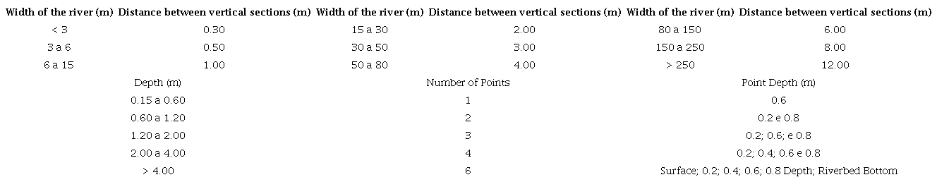 The flow velocity was measured using the FP111 Global Water Flow Probe (CARVALHO et al., 2020). The methods used to measure the flow velocity followed the 1967 Hydrological Norms and Recommendations, and the 1977 Hydrometric Manual for Hydrometry Services, by the Department of Water and Electricity (SANTOS et al., 2001) (Table 1).