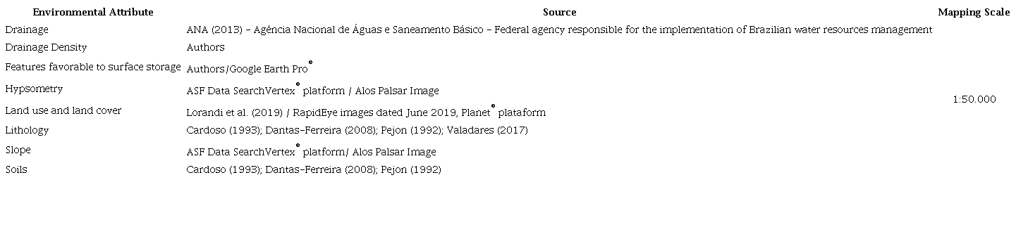 To assess the hydrological regime of the sub-watersheds, the attributes of the natural environment (hypsometry, slope, geology and soils) and the anthropic environment (land use and land cover) were integrated into the analysis, all in the 1:50.000 scale (Table 2).