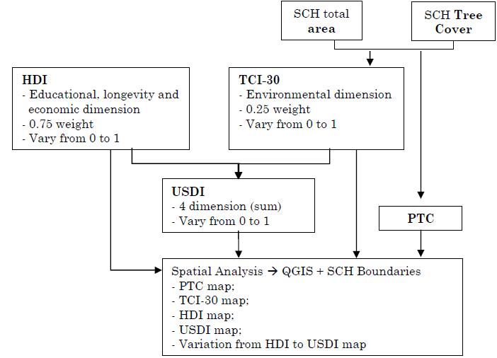 Considering that HDI measures standard of living (UNDP, 2020), comparing it with PTC values directly is not really accurate - because the assumption of PTC equals to 100% being equivalent to 1 does not reflect an ideal setting. This fact justifies the need for TCI-30 composition, as a way to allow its comparison with HDI and enable USDI composition. Then, a 30% of tree cover or higher was considered equivalent to 1, in other words, suitable for a greater quality of life (SILVA, 2016).