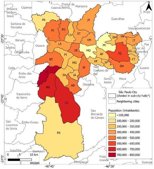 São Paulo is a city located in south-eastern Brazil (Figure 2), being the most populous capital of the country with an estimated population of 12.325.232 million and a demographic density of 8,102.79 people/km² (IBGE, 2020). The average City HDI (or HDI by city) is about 0.805, similar to cities such as Philadelphia and Dallas (U.S.) (AGOSTINI; RICHARDSON, 2003). However, it is worth mentioning that the São Paulo average HDI does not reflect its entire reality, once the values per sub-city halls range from 0.680 to 0.968 (SÃO PAULO, 2020)