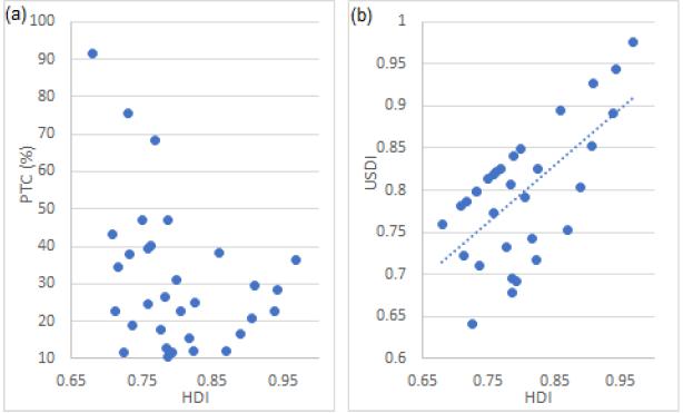 In addition, there is no perceptive relation or evident pattern between PTC and HDI (Figure 5a). On the other hand, when PTC is assimilated in a normalized and weighted way, though UDSI, it is possible to emphasize some level of linear relation between HDI and the developed index (Figure 5b).