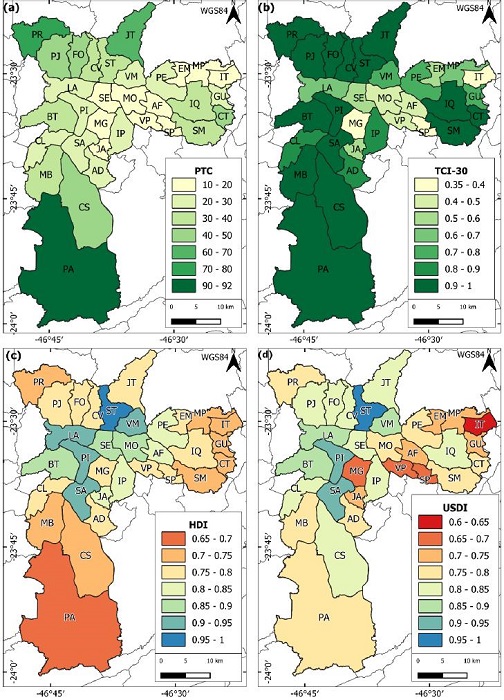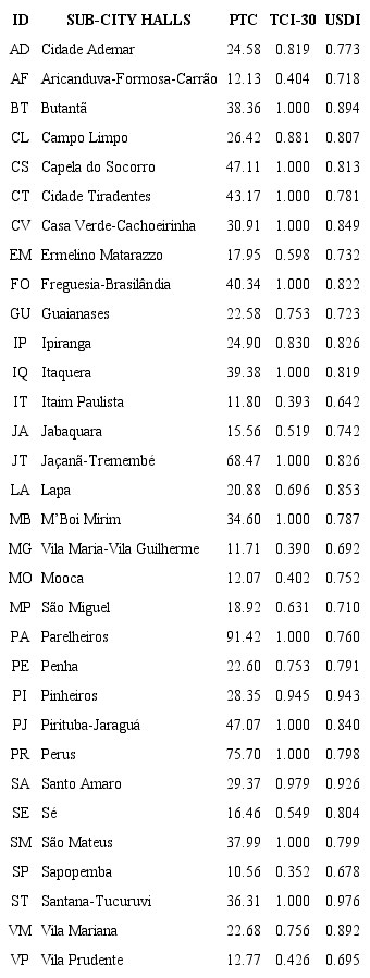 As retrieved in the introduction section, tree cover has an important role in urban areas, exceeding the limits of carbon emissions and material footprint (DA SILVA et al., 2016; SCHEUER, 2016; ANJALI; et al., 2020). An intermediate alternative could include them, nevertheless, data specifically related to each SCHs were not available and the adoption of the entire city values would affect USDI equally, generalizing the results to the desired scale. Consequently, TCI-30, representing PTC, was prioritized.