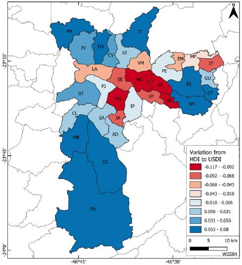 The incorporation of PTC resulted in an average reduction of 0.004 in HDI values, however, the average does not represent the reality in all sub-city halls. In order to provide a better understanding of changes, Figure 7 illustrates the spatial variation of the increase and decrease in quality of life index, from HDI to USDI.