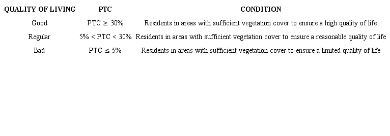 The WHO advises a minimum of 9m2 of green area per capita in the urban area (RUSSO; CIRELL, 2018). Oke (1973) estimates that a percentage of tree cover (PTC) around 30% is recommended to provide an improvement in the thermal sensation in urban areas. Agreeing with this author, the parameters determined by the WHO also indicates 30% of PTC as suitable for providing a high quality of living (Table 1).