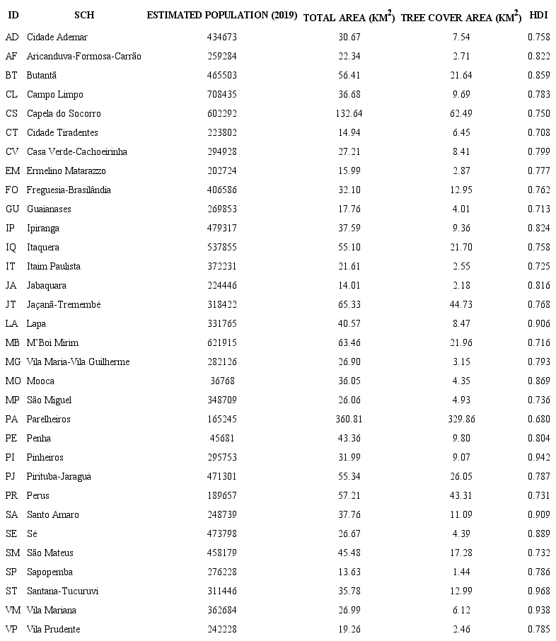 SCH boundaries (shapefiles file format) and their respective population number were obtained from Brazilian census database made available by the Brazilian Institute of Geography and Statistics (IBGE, 2010). Data referring to tree cover area were obtained from an official government report, based on LiDAR imaging data (SÃO PAULO, 2020). Then, considering each SCH total area and its respective vegetation cover area, Percentage of Tree Cover (PTC) was calculated. HDI values were gathered from the Atlas of Human Development in Brazil (UNDP et al., 2013). Table 2 identifies the SCHs ID - as illustrated in Figure 4 - and their respective names, population number, values of total area, tree cover area and HDI.