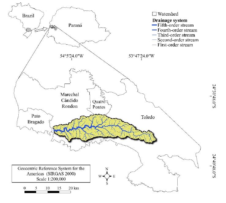 The Marreco River watershed lies in the municipalities of Toledo, Quatro Pontes, Marechal Cândido Rondon, and Pato Bragado (Figure 1) in western Paraná, in the southern region of Brazil, and is approximately 338.8 in area. The source of the Marreco River is in the urban area of Toledo and its mouth is on the São Francisco River located on the border between the municipalities of Pato Bragado and Marechal Cândido Rondon. According to Köppen’s climate classification system, the basin is in a region of Cfa climate, i.e., subtropical climate with hot summer (IAPAR, 2020).