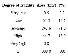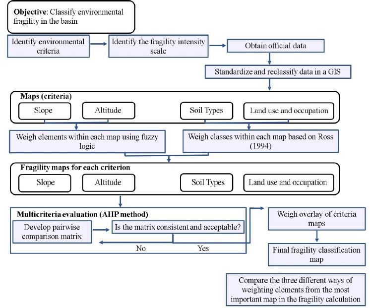 The use of fuzzy logic allowed representing the variation of environmental characteristics and their degree of importance in the analysis of fragility. Moreover, the AHP method established hierarchical levels for the criteria through consistent calculations.