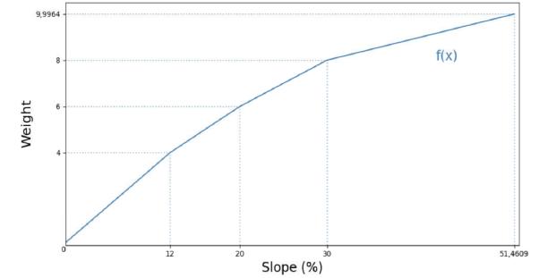 To elaborate the membership function that attributed weights to the elements of the slope map, the minimum and maximum slope (51.46%) values found in the basin, the limits of the hierarchical categories of Ross (1994), and a linear interpolation of these limits were used (Figure 3):