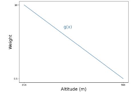 Based on this information, a linear membership function with negative angular coefficient was used to distribute weights to the elements in the altitude map. The fragility values closer to 0 (zero) were associated with maximum altitude (596 m), in regions with lower erosivity caused by rainfall. Fragility values closer to 10 were associated with the minimum altitude (216 m), according to function (Figure 4).