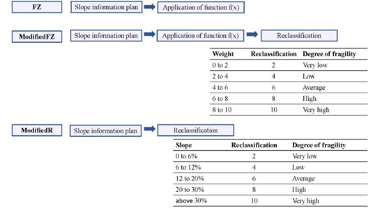 A comparison was made between three different forms of weighing elements of the map with the higher weight (slope) to verify its influence on the final fragility map. The first technique is described throughout the work and determined only by the application of the continuous membership function ; the second is determined using the function and subsequent reclassification of the resulting raster file; the third is determined by the reclassification of the raster file using the hierarchical categories of Ross (1994) (Figure 5). The three ways are called Fuzzy (FZ), Modified Fuzzy (ModifiedFZ), and Modified Ross (ModifiedR), respectively.