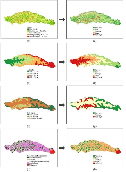 Figures 6 e - h present reclassified maps according to the degree of fragility provided in Tables 1 and 2 and the membership functions and . The soil types in the basin mostly have average fragility regions (54.5%) with the Red Nitosol. Land use and occupation mostly contain high fragility regions (57.1%) represented by agriculture (Table 5). According to slope and altitude, the predominant degree of fragility is low, with 50.4% and 25.7%, respectively (Table 6).