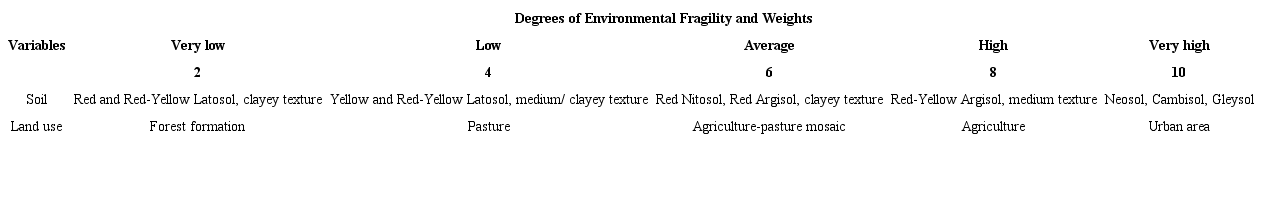 Tricart (1977) noted that the environment remains in dynamic equilibrium through its natural relations of exchange, and he suggested a model to assess the degree of instability using information about pedogenesis and morphogenesis. Ross (1994) adapted this model with information about human intervention, geomorphology, soils, vegetation cover, and climate by establishing different importance for each of these variables. Crepani (2001) used variables such as relief dissection index, rock, soil, and vegetation cover and established an equal weighting for environmental variables in the fragility study. Different results for fragility were obtained by each of these models. Dalla Corte et al. (2015) researched weighting variables and concluded that the methodology of environmental fragility analysis is highly dependent on the choice of weighting factors and is related to the context in which it is performed.