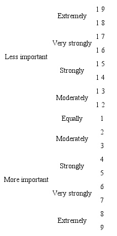 A multicriteria analysis method, Analytic Hierarchy Process (AHP) developed by Thomas L. Saaty, was used to support the study. AHP is a method of choice based on pairwise comparison and a predefined scale to express the importance of one criterion over the other in relation to decision-making (SAATY, 1990; SAATY, 1991; SAATY E VARGAS, 2012). In addition, it is concerned with the level of consistency of the calculations and can be applied to quantitative or qualitative information (SAATY, 1987).