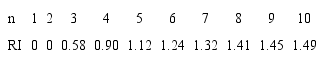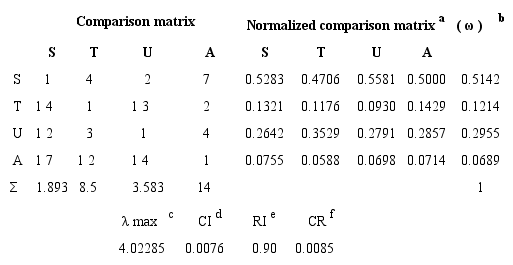 The subjectivity of judgments based on researchers’ experiences can result in inconsistencies in the final matrix. The inconsistency is measured through the consistency ratio (CR) that relates the consistency index (CI) of the matrix in question with the consistency index obtained from the -order reciprocal matrix with non-negative elements randomly generated (RI) (Table 4). The value of CR must be less than 0.1 or 10% for satisfactory consistency and for the experts’ judgment to be considered reliable. (SAATY, 1990).