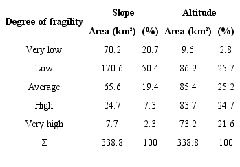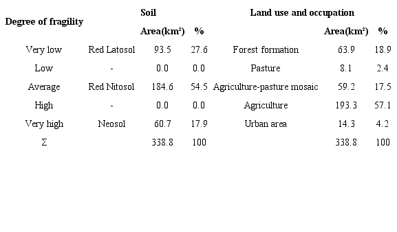 The distribution of slope values in the fragility scale was based on Crepani et al. (2001) and Ross (1994). Fragility values closer to 0 (zero) were associated with lower slope, i.e., regions where soil-forming processes predominate. Values closer to 10 were associated with greater slope, i.e., regions where erosive and landslide processes predominate.