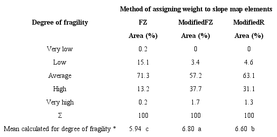 The comparison of three different forms of weighing the elements of the slope map indicated that the basin mostly has average environmental fragility (Table 9). The FZ method classified a larger area as very low (0.2%) and low (15.1%) fragility than the ModifiedFZ (0% and 3.4%, respectively) and ModifiedR method (0% and 4.6%, respectively). This difference can be explained by the variation of weights according to variation of the elements on the slope map in the FZ method in contrast to the other two that classified different elements with the same weight (Figure 5).