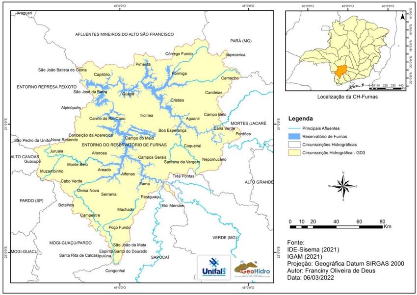 A CH Furnas é composta por 50 munícipios, sendo 34 lindeiros ao reservatório (Figura 1), possui área de 16.643km2 e população estimada de 949.599 mil habitantes (IGAM, 2021; IBGE, 2021).