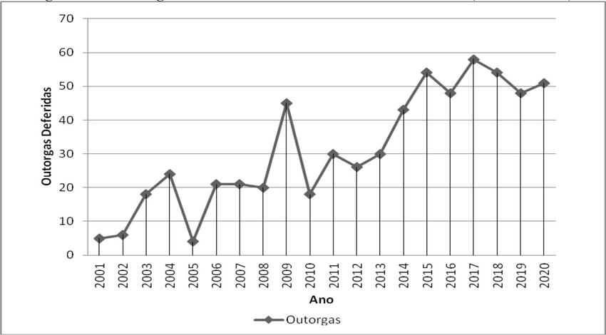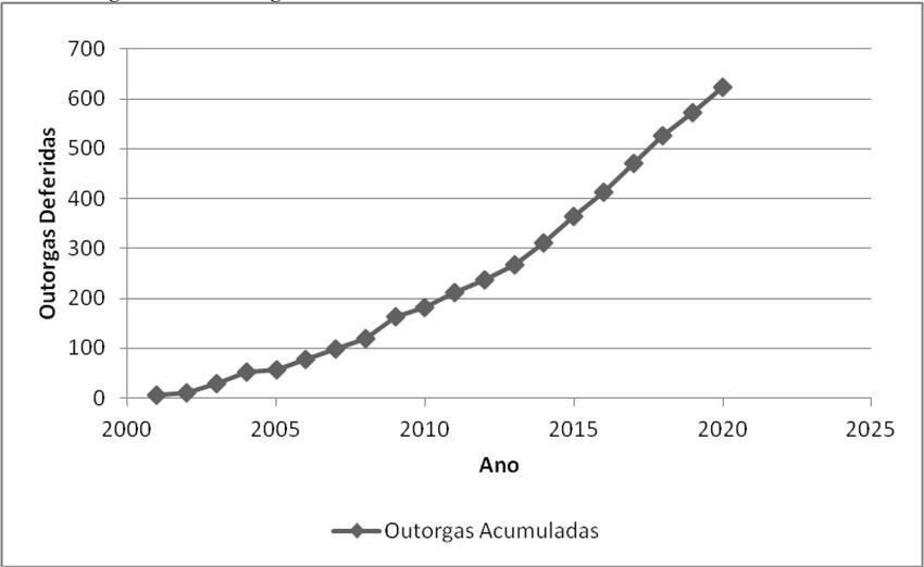 Após a verificação de consistência, identificou-se 624 outorgas deferidas na área da CH Furnas no período entre 2001 e 2020 (Figura 2), com tendência ao incremento do quantitativo de outorgas, obtendo média anual de aproximadamente 31 outorgas subterrâneas concedidas.