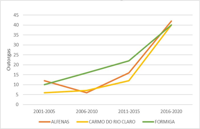 A partir do ano de 2012 verificou-se um aumento de concessões de outorgas subterrâneas para os municípios pertencentes da CH Furnas, a exemplo dos municípios de Alfenas/MG, Carmo do Rio Claro/MG e Formiga/MG (Figura 4).