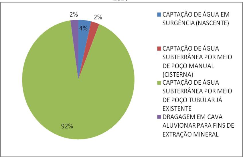 Em relação ao modo de captação da água suberrânea, verificou-se que a captação por meio de poço tubular já existente, representa 92% das outorgas deferidas entre os anos de 2001 a 2020 (Figura 5), sendo que esse tipo de captação é realizado principalmente para o consumo humano e abastecimento público.