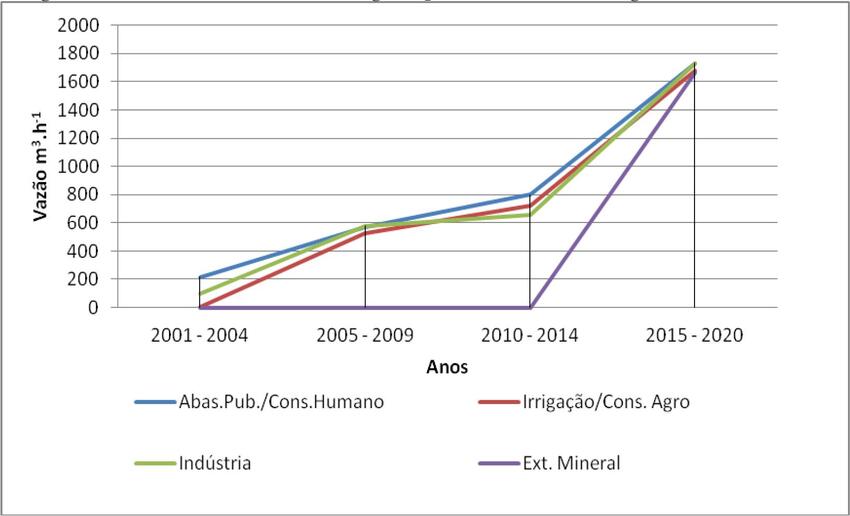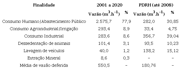 No quadro 1 observou-se que a finalidade de Consumo Humano/Abastecimento Público apresentou considerável crescimento a partir do ano de 2008, como também a finalidade de Consumo Agroindustrial/Irrigação que até 2008 apresentava uma vazão consumida de 33,4 m3.h-1 e que no lapso temporal de 2001 a 2020 passou para 293,4 m3.h-1.