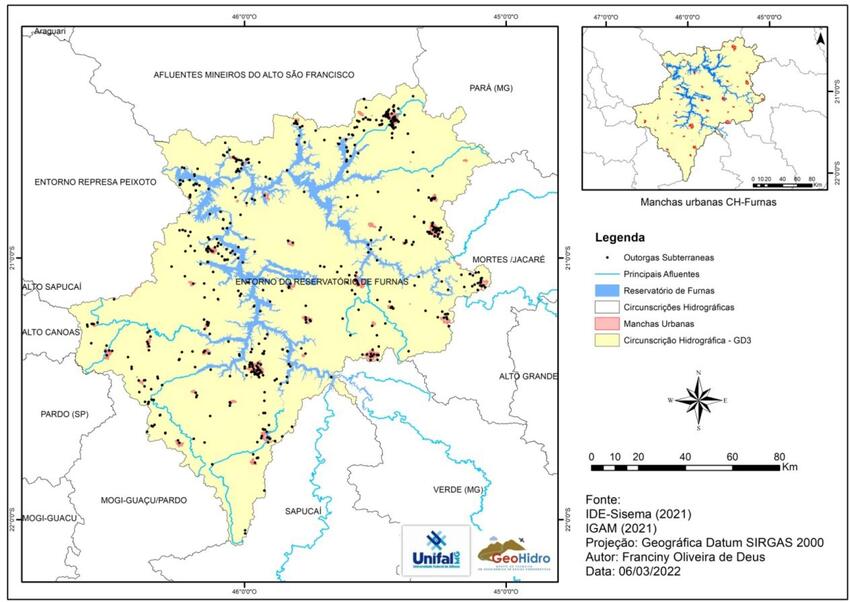 Confeccionou-se a base cartográfica da CH Furnas, com temas que abordam os limites das unidades de gestão de recursos hídricos do Estado de Minas Gerais, reservatório de Furnas, rede hidrográfica e rios principais, limites administrativos (municípios), sedes administrativas municipais, bem como as outorgas de uso dos recursos hídricos subterrâneos.