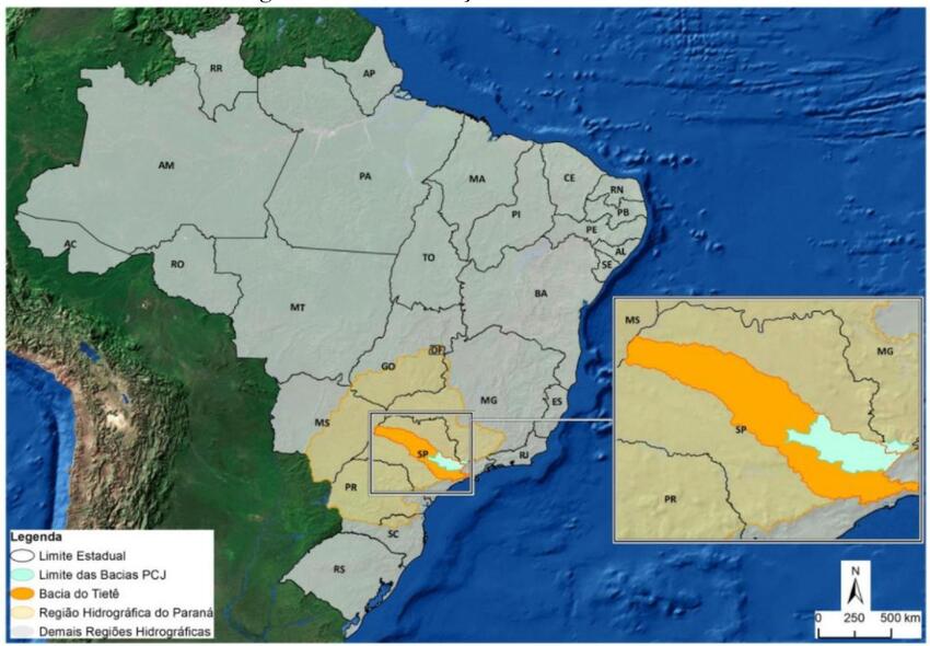 As bacias dos rios Piracicaba, Capivari e Jundiaí (PCJ) pertencem à bacia do rio Tietê, na região hidrográfica do rio Paraná, com uma área de aproximadamente 15mil km2, dos quais 92,5% encontram-se no estado de São Paulo e o restante em Minas Gerais (Figura 1). A área das bacias PCJ é destinada prevalentemente a: campo (25%), mata nativa (20%), cana-de-açúcar (19%) e espaço urbano (12%). Nela encontram-se 44 Unidades de Conservação das quais 25% são de proteção integral e o restante de uso sustentável (CONSÓRCIO PROFILL-RHAMA, 2020).