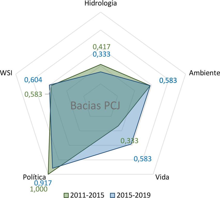 Esta limitação pode ser parcialmente superada se o valor global do WSI estiver sempre acompanhado pelos valores dos subíndice, como nas Tabelas 1 e 2 e na Figura 2. A representação gráfica se sobressai na comunicação do resultado visualizando a transformação ocorrida, indo além da simples comparação numérica do WSI e ilustrando quais são as dimensões mais críticas da sustentabilidade nas bacias PCJ.
