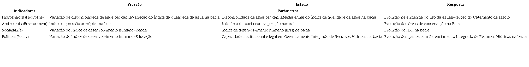 Um exemplo do uso integrado do modelo HELP para classificação dos indicadores e do modelo PER na definição dos parâmetros, inspirado na metodologia proposta por Chaves e Alipaz (2007) encontra-se no Quadro 1.