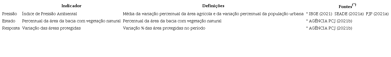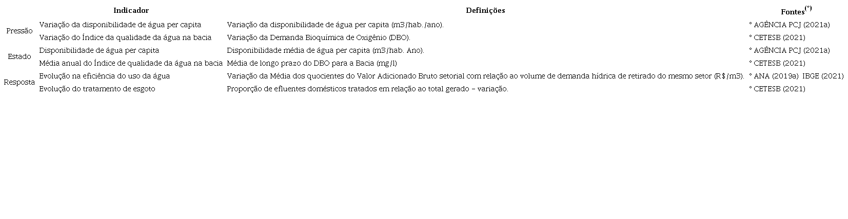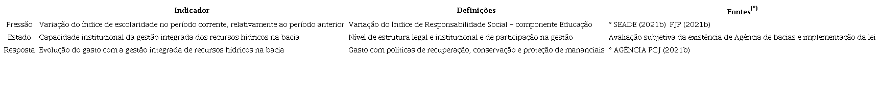 Para cada uma das quatro dimensões do modelo HELP foram calculados os indicadores de Pressão, Estado e Resposta. No caso da dimensão Hidrologia foram consideradas variáveis relacionadas tanto à quantidade quanto à qualidade da água. Nos Quadros 2a-2d encontram-se os indicadores, suas definições e fontes dos dados usados na avaliação da sustentabilidade nas bacias PCJ.