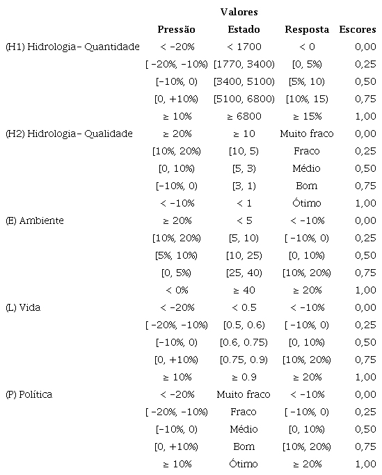 Onde Subíndicei = H se a dimensão é hidrologia, E se é a ambiental, L se a dimensão é vida e P se a dimensão é política.