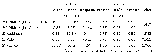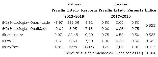 Seguindo a metodologia detalhada na seção anterior foram calculados os indicadores, os subíndices e o índice de sustentabilidade (WSI) das bacias PCJ nos dois períodos 2011-2015 e 2015-2019 (Tabelas 2 e 3).