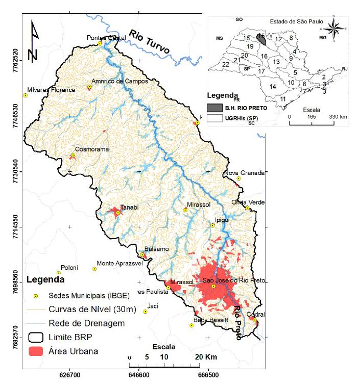 A bacia do Rio Preto (BRP - 2.866 km²), afluente do Rio Turvo, está localizada na Unidade de Gerenciamento de Recursos Hídricos “Turvo-Grande” (UGRHI 15), à Noroeste do Estado de São Paulo e compreende 16 municípios, entre eles, o município de São José do Rio Preto (SP) (Figura 1). O clima regional, segundo classificação proposta por Köeppen-Geiger, é o “Aw” (tropical com inverno seco) com estação chuvosa no verão, nítida estação seca no inverno e precipitações podendo chegar a 1.800 mm/ano (ALVARES et al., 2014; FOREST-GIS, 2015; EMBRAPA, 2021).