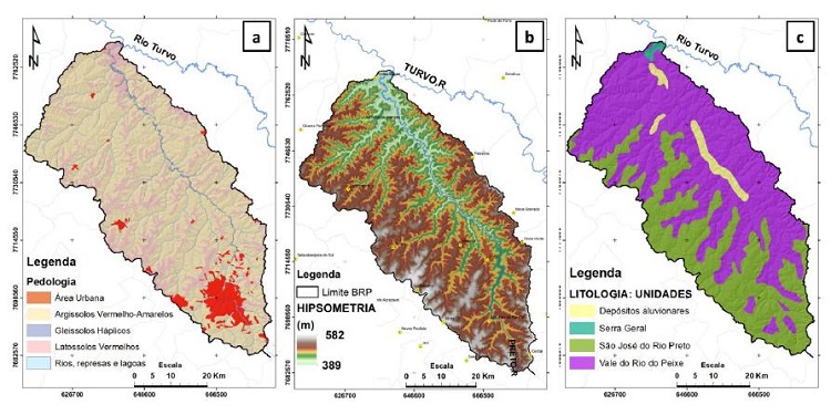 As informações pedológicas foram obtidas do mapeamento de solos do Estado de São Paulo, revisado e unificado por Rossi (2017), em escala de 1:250.000 (Figura 2a). Na maior parte da BRP são observados os Argissolos Vermelho-Amarelos e nos topos planos os Latossolos Vermelhos. Já no vale do rio Preto se observa a ocorrência de Gleissolos Háplicos e Neossolos Flúvicos.