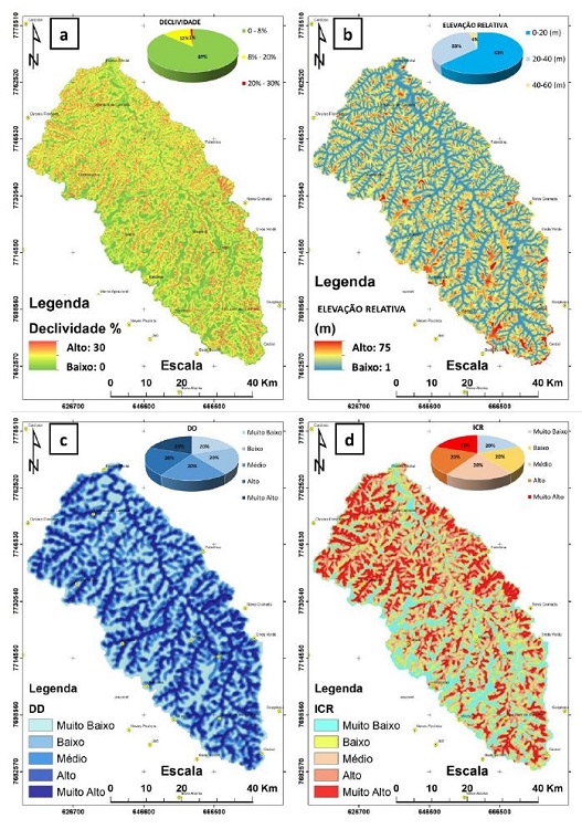 As variáveis DD e ICR refletem os aspectos de dissecação da BRP em cinco classes, que variam de muito alto a muito baixo (Figuras 3c e 3d). Os mapas possuem uma distribuição regular das classes devido ao método de classificação utilizado (Quantil), sugerido por Sampaio e Augustin (2014), utilizado também por Nazar e Rodrigues (2019).