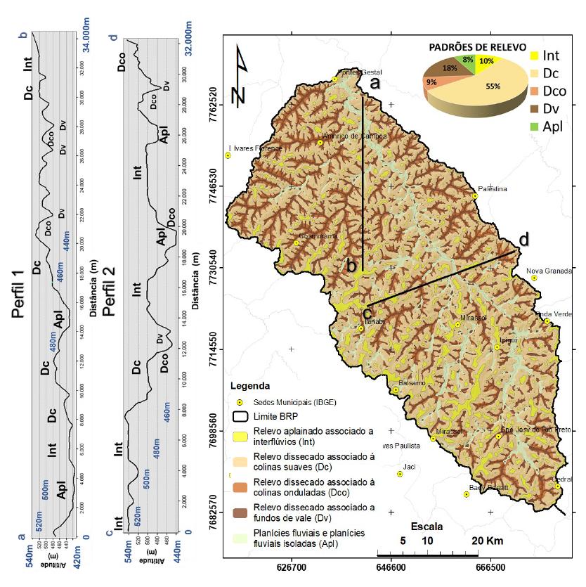 A Figura 4 apresenta o mapa das classes dos padrões do relevo, conforme apresentado na Tabela 2, onde foram traçados dois perfis topográficos representativos das classes mapeadas. Na seção a-b (perfil 1), em “a”, observa-se um relevo pouco dissecado associado a uma colina suave convexa (cota 470m), próximo do exutório da BRP. O perfil atravessa a planície fluvial do Rio Preto (cota 420m), seguindo por um compartimento de colinas suaves na formação do Vale do Rio do Peixe, até alcançar as cotas mais elevadas (520m), na formação do Vale do Rio Preto, onde ocorrem colinas onduladas, intercaladas por vale dissecados; finalmente chegando em “b”, em um interflúvio aplainado à 520m de elevação.