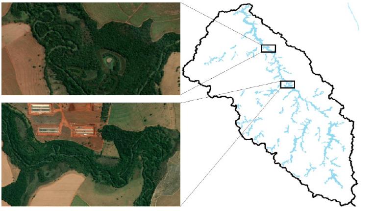 Trata-se de feições deposicionais quaternárias formadas a partir dos detritos depositados durante as cheias dos rios (8%). São áreas aplainadas nos fundos dos vales e, portanto, associadas a valores baixos de dissecação (Tabela 2). Imagens de satélite do Google Earth revelam feições importantes na delimitação dessas áreas como meandros abandonados e outras paleoformas vinculadas aos processos fluviais produzidas pelos eventos de cheias e vazantes (Figura 9).