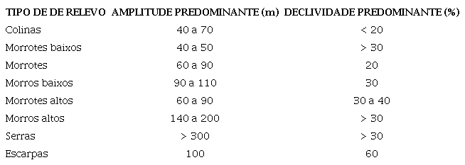 A compartimentação geomorfológica se baseou nos pressupostos de Ross (1992), sendo abordado o táxon que trata dos padrões de formas (3º táxon) e o 4º táxon, que representa as formas individualizadas, neste caso, indicadas no conjunto dos padrões de formas. Os parâmetros morfométricos utilizados para a classificação dos modelados de dissecação foram a declividade e amplitude altimétrica, tendo sido observado os critérios apresentados por CPRM/IPT (2014) (Tabela 1).