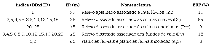 Cinco padrões de relevo (equivalentes ao 3º táxon de Ross) foram identificados a partir da chave de classificação que leva em consideração a gênese, a dissecação global e a ER das formas de relevo. A maior parte da área de estudo possui relevo aplainado e/ou associado às colinas suaves (65%) onde se observa a expansão das atividades agrícolas na BRP. O relevo dissecado associado a colinas onduladas corresponde a 9% da área de estudo sendo naturalmente zonas de maior fragilidade potencial, qualidade inerente ao próprio sistema, resultante de processos morfodinâmicos e morfogenéticos. As áreas dissecadas associadas aos fundos de vale (18%) são áreas importantes para a manutenção da qualidade hídrica regional e, portanto, devem ser pensadas como locais a serem conservados. Já as planícies fluviais e as planícies fluviais isoladas correspondem a 8% da área de estudo e são ambientes muito frágeis e importantes para o equilíbrio dos sistemas ambientais físico e biótico da BRP.